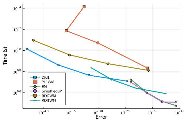 We compare those methods to the strong Euler-Maruyama EM()1 and the simplified Euler-Maruyama SimplifiedEM()1 schemes.
